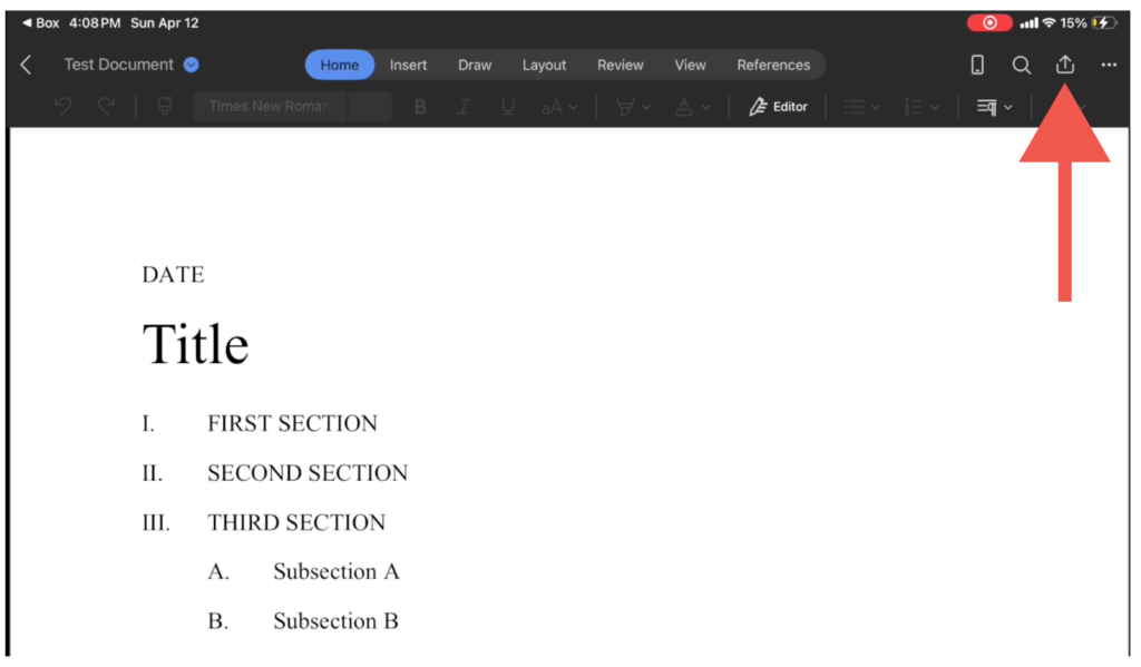 2. While inside your word Doc tap the “share” icon on the top right corner of your iPad. (it is to the left of the “three dots” icon and looks like an up arrow inside an open box.)